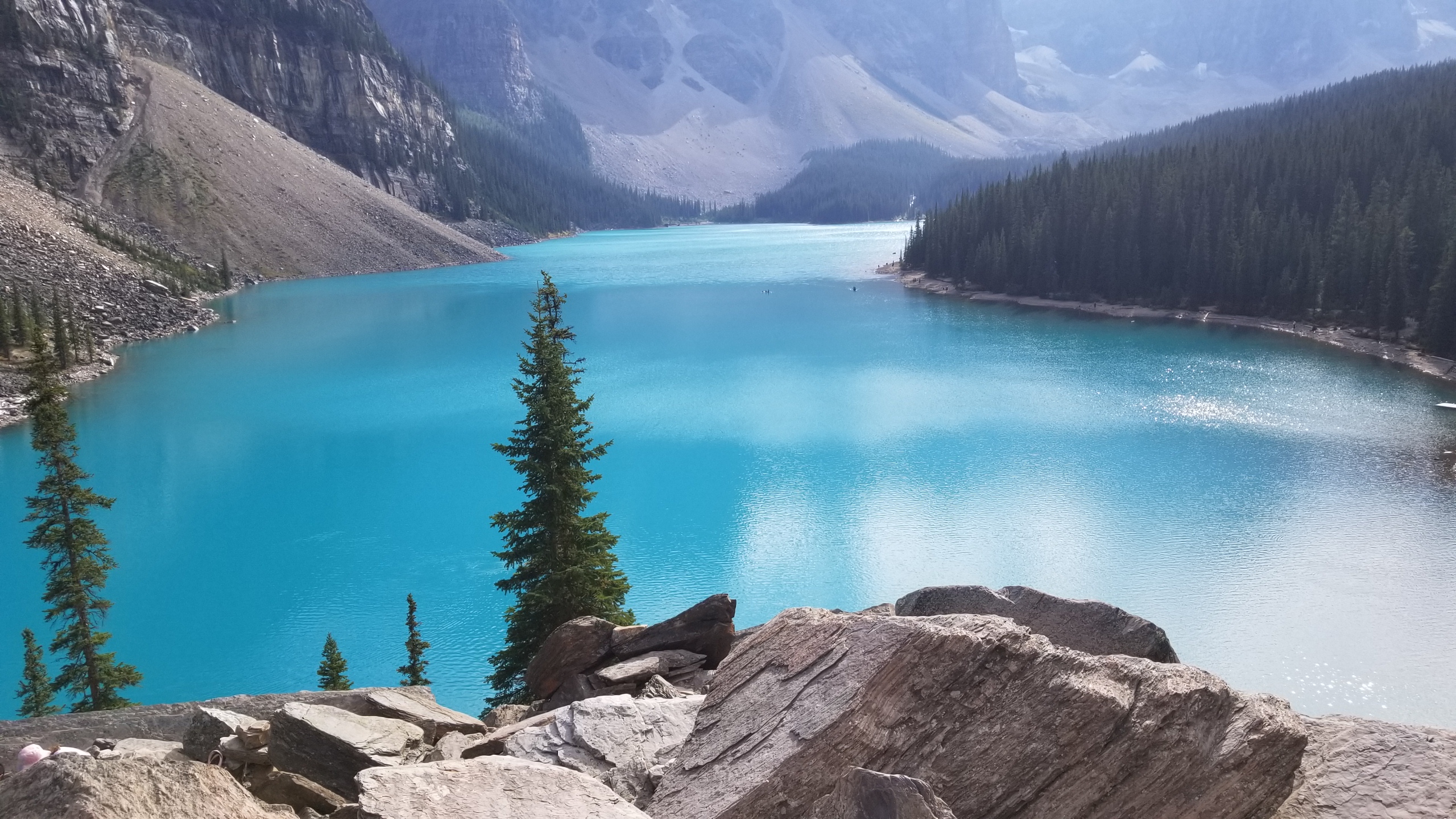 모레인 레이크 주변을 도는 트레일 Moraine Lake Shoreline Trail은 호수의 반 정도를 다녀오는 오솔길 트레일이다. 왕복에 2.9킬로미터 정도 아주 쉬운 코스이다. 호수를 따라 돌아 중간 지점에 도착했다. 이 지점에서 산쪽에서 내려오는 시냇물과 합쳐지고 도보로는 더 이상 갈 수가 없다. 카누를 타고온 사람들도 보인다.