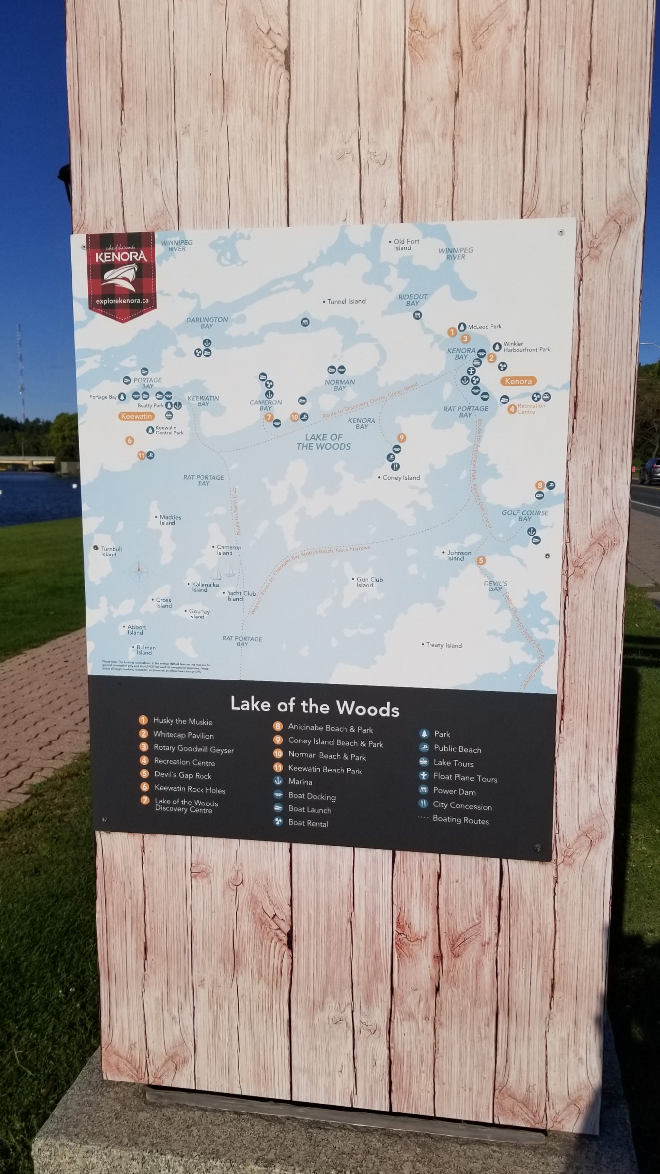 오대호까지 가지 전 매니토바에서 온타리오로 들어서는 1번과 17번 고속도로 주변 지도를 확대시켜보면 크고 작은 수많은 푸른 점들 (호수들)을 볼 수 있다. 여기서 큰 호수 Lake of the Woods에는 해안선만 십만 킬로를 넘고 호수 안에 섬이 만오천 개 가까이 있다고 한다 (14552개). 이 호수의 북쪽 경계 쪽에 위치해 있어 호수를 가까이 만날 수 있는 작은 도시 케노라 Kenora에 차를 세운다.