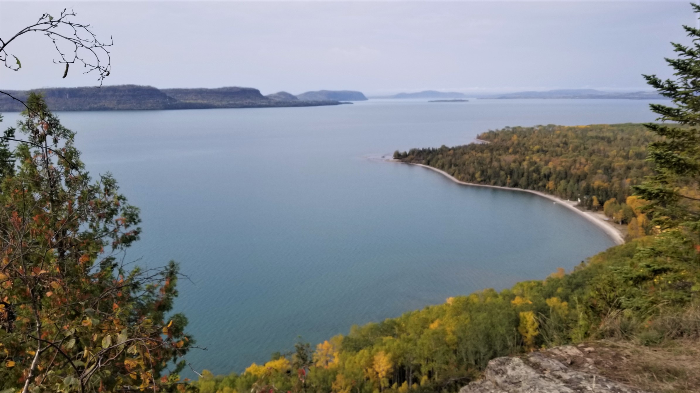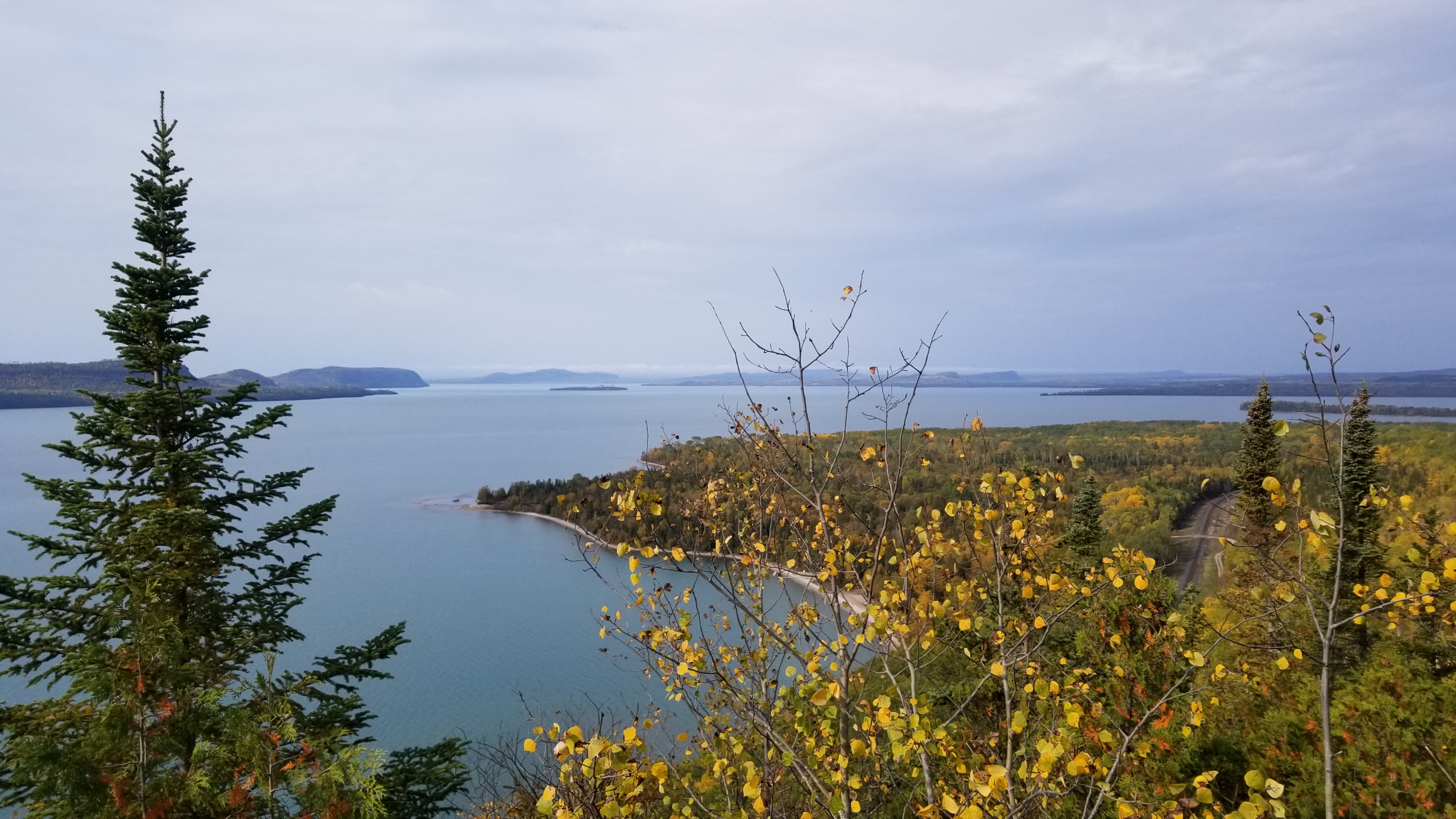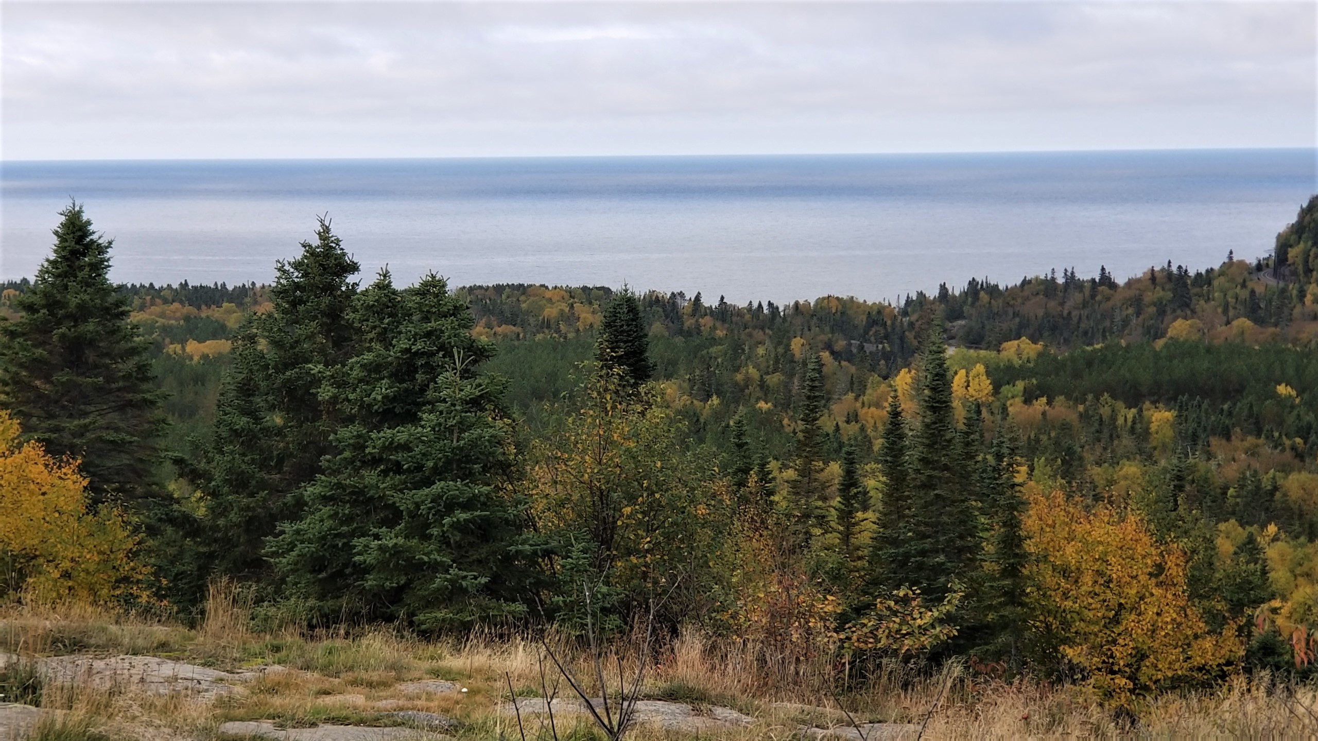 아래는 마라톤을 지나 한참 가다 길옆에 숨어있는 전망대 중의 하나다. 전망대로 올라가는 길이 숨어있어 잘 보이지도 않은데 바다 풍경을 보고 용케 찾아올라갔다. 지도로 보아, 아래로 내려다 보이는 숲은 Neys Provincial Park이다.