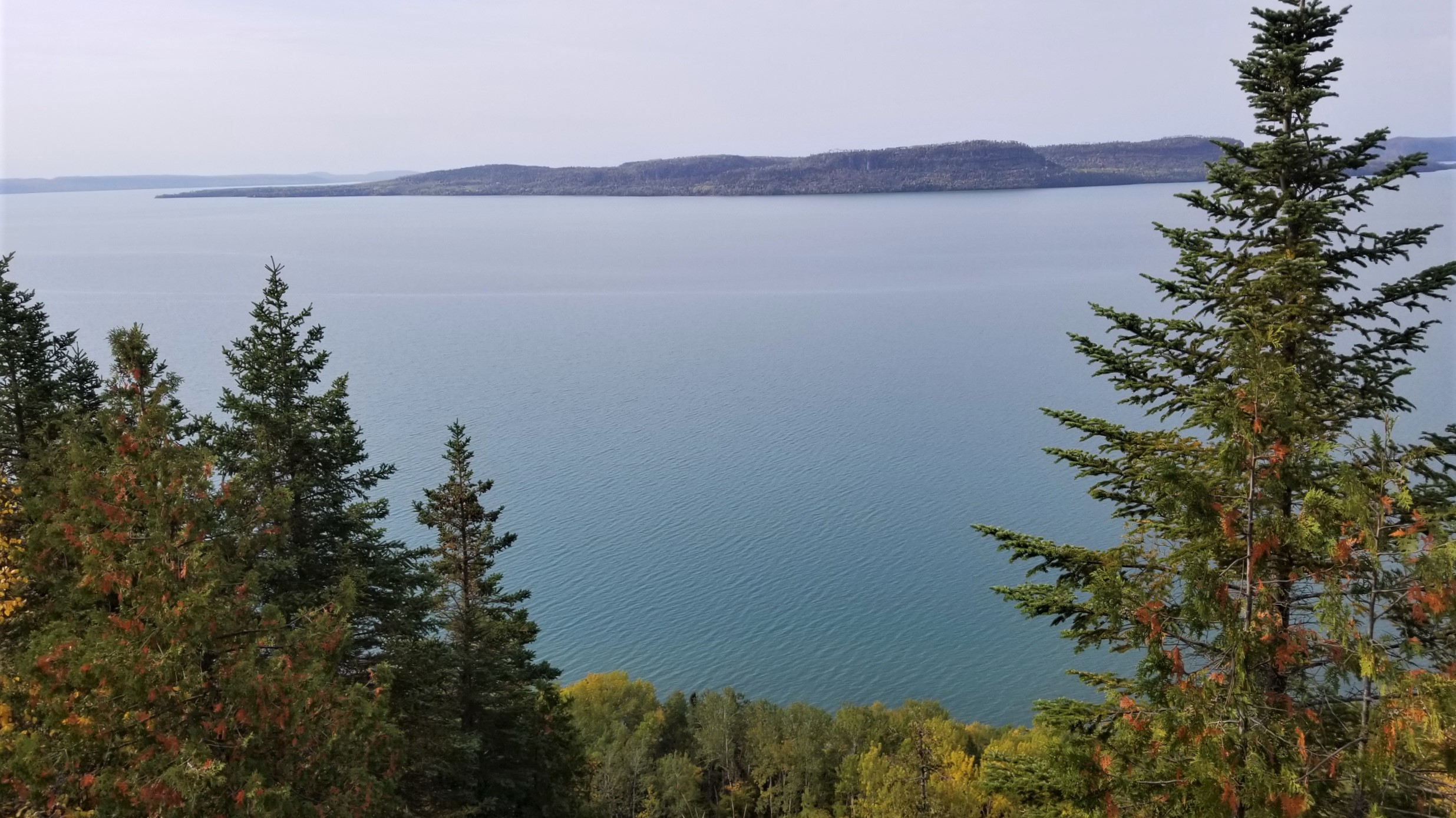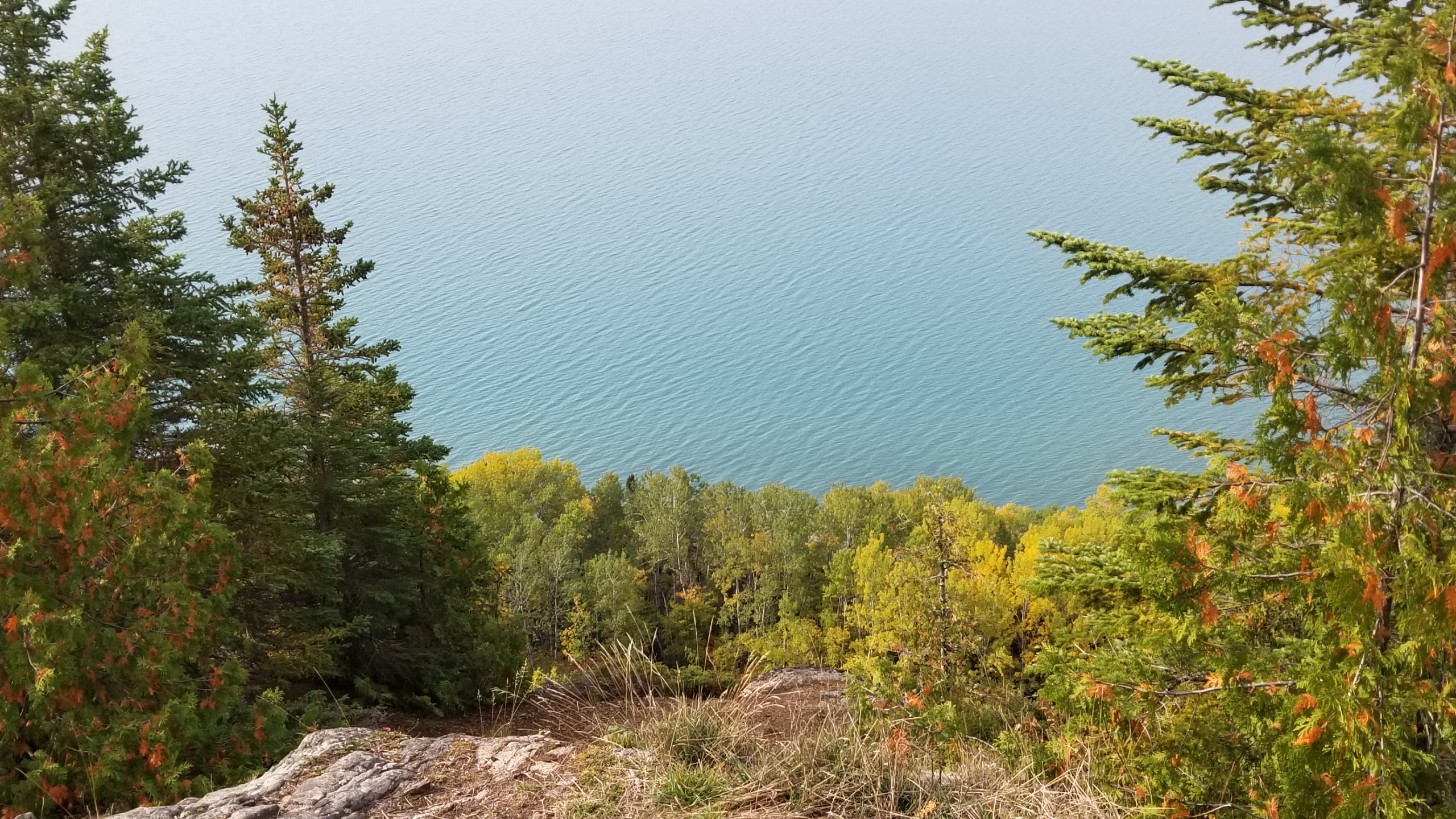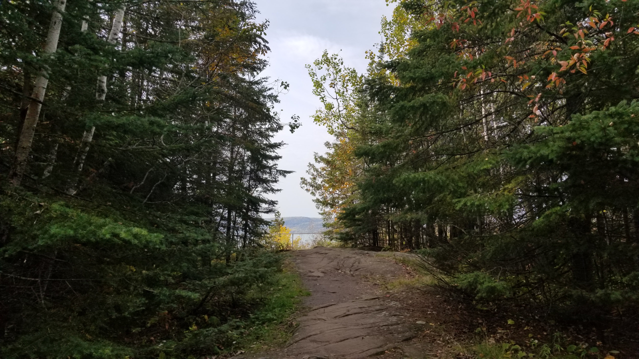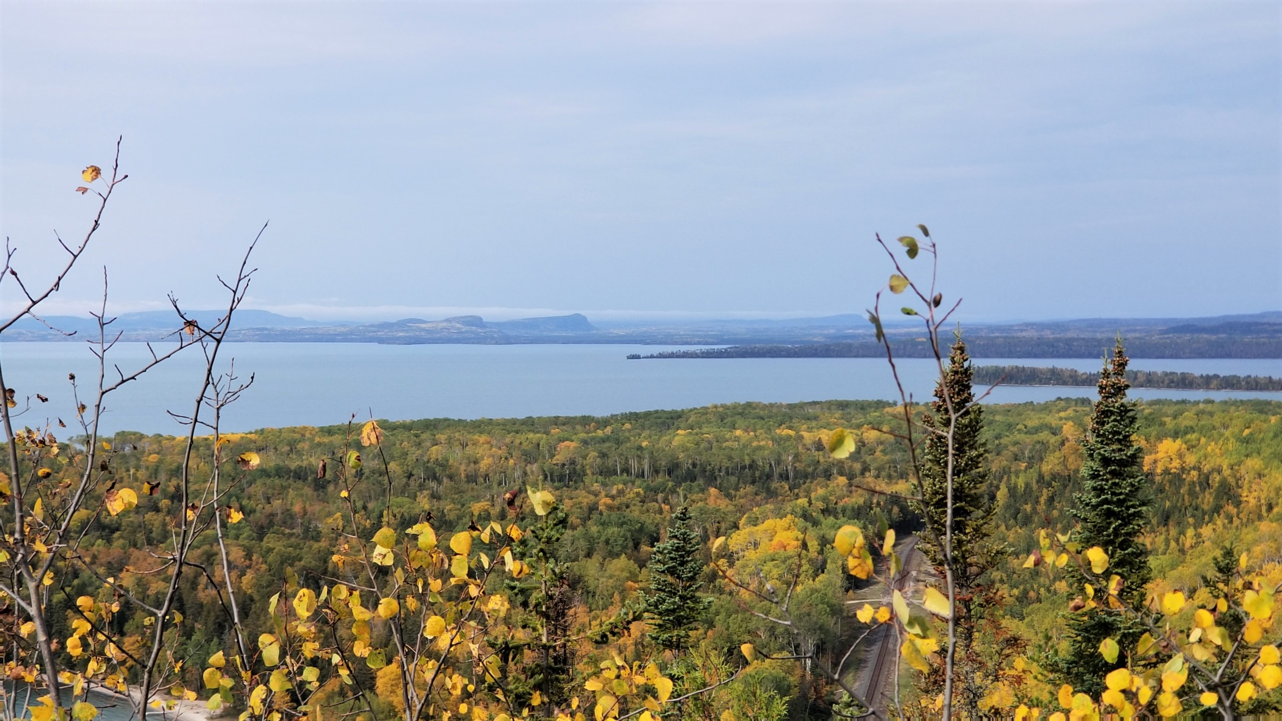 아래는 마라톤을 지나 한참 가다 길옆에 숨어있는 전망대 중의 하나다. 전망대로 올라가는 길이 숨어있어 잘 보이지도 않은데 바다 풍경을 보고 용케 찾아올라갔다. 지도로 보아, 아래로 내려다 보이는 숲은 Neys Provincial Park이다.